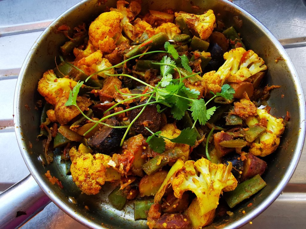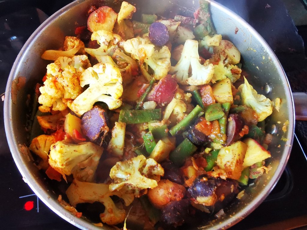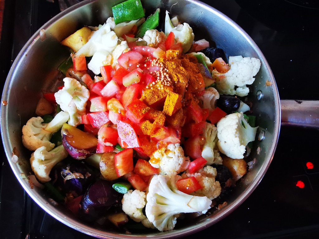 Het ghee and fry onions and ginger for two minutes. Add potato and cook until lightly coloured. Add cauliflower and beans with salt and cook briefly. Dice the tomato and add to the pan with the turmeric, chilli powder and mustard seeds. Cover and cook until the vegetables are tender but be careful not to over-cook or it becomes a monochromatic mush instead of a beautiful jewel-like mixture.