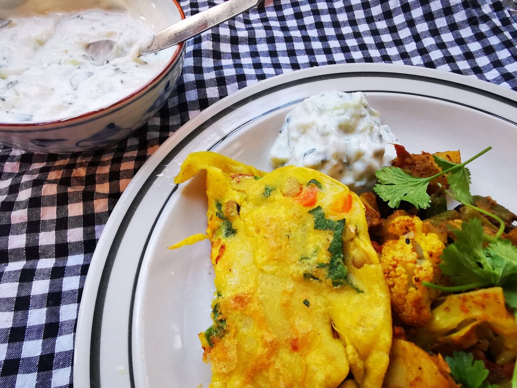 1 cup or more of thick yoghurt, seasoned with salt and cumin powder, mixed with 1/2 cup grated cucumber which has been salted and left to drain in a colander for 20 minutes, then rinsed and squeezed dry.