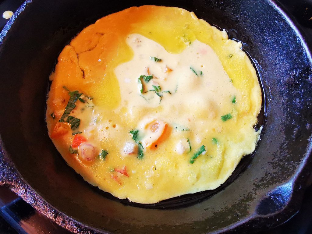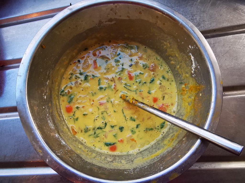 To make the pancakes: Whisk the water and chickpea flour together gradually with a fork to avoid lumps. It should be like thick cream. Its best if left for two hours or up to a day to hydrate the flour and dissolve any lumps. Just before you are ready to cook add the remaining ingredients. Cook in oil or ghee as you would a pancake.