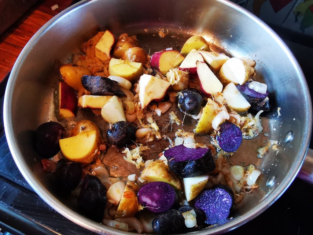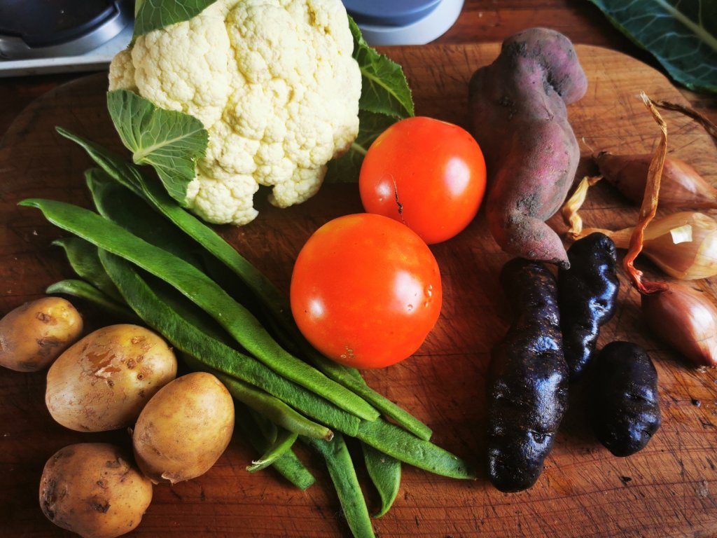 To make the Sabzi: Break the cauliflower into florets . Peel and cube the potato (I used white and purple potatoes plus kumara). Slice onions thickly. Cut beans into 5 cm pieces. Shred the ginger on a coarse grater.